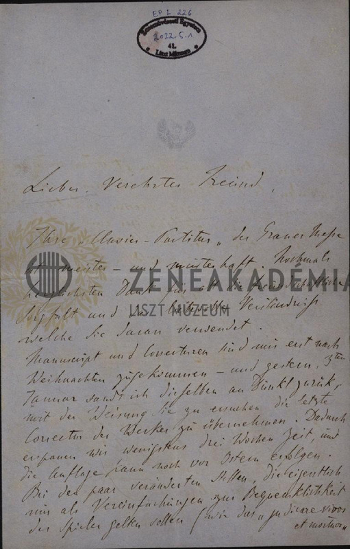 "Lieber verehrter Freunde" megszólítással. Az Esztergomi Mise zongorás átiratával kapcsolatban.