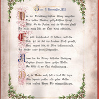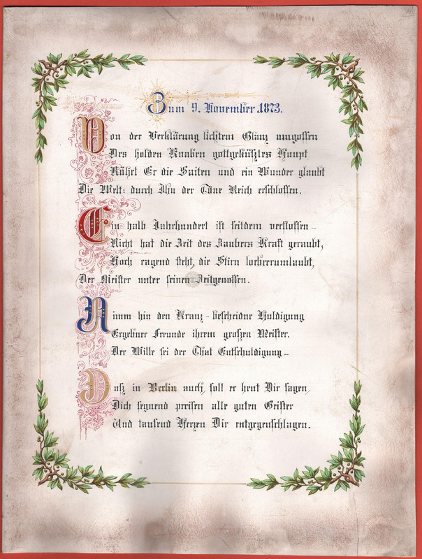 Költemény (szonett) Liszt 50. művészi jubileumára berlini tisztelőitől,a betétlapon aláírásokkal. A szonett címe: " Zum 9. November 1873".