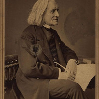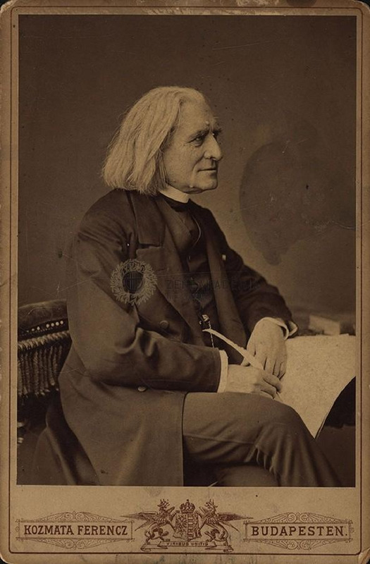Liszt Ferencet ábrázoló eredeti fénykép, melyet Kozmata Ferenc készíthetett. Az abbéruhás Liszt bal kezével az asztalra és az asztalon levő kottára támaszkodik, kezében lúdtoll.