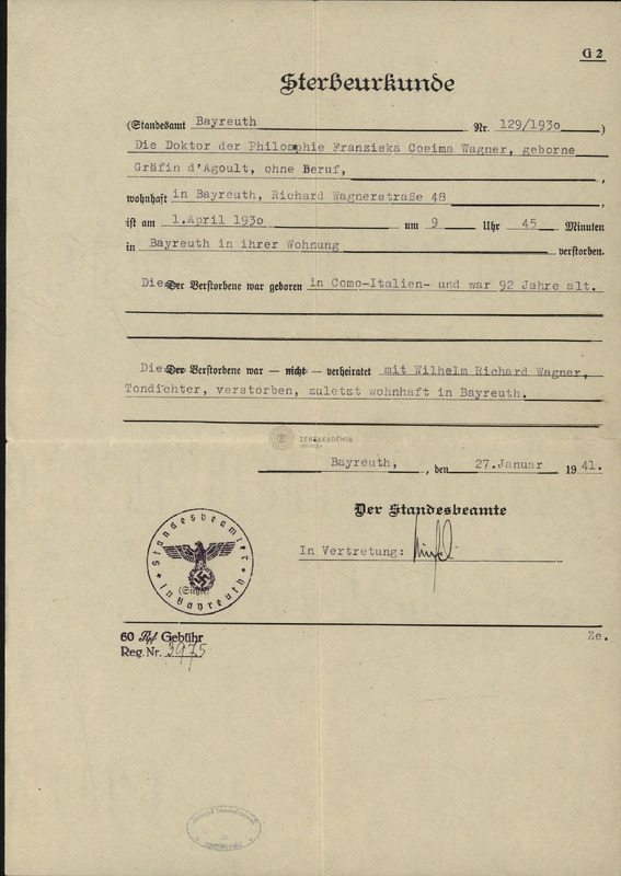 Sterbeurkunde von Franciska Cosima Wagner, Bayreuth. Német nyelvű.