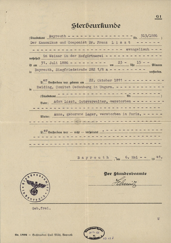 Liszt Ferenc halotti bizonyítványa (kiadva: Bayreuth, 1941. május 6.)