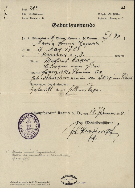 Maria Anna Lager születési bizonyítványa (kiadva: Krems, 1941. jan. 18.)