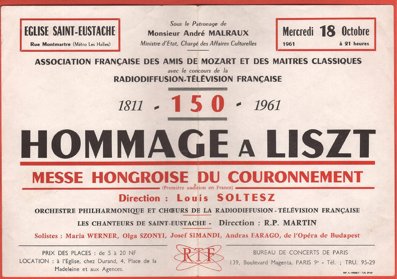 A MAGYAR KORONÁZÁSI MISE franciaországi bemutatója, André Malraux támogatásával, Liszt születésének 150. évfordulója alkalmából. A francia rádió és televízió közreműködésével. Vezényel: Soltész Lajos. Szólisták: Wermer Mária, Szőnyi Olga, Simándi József, Faragó András.