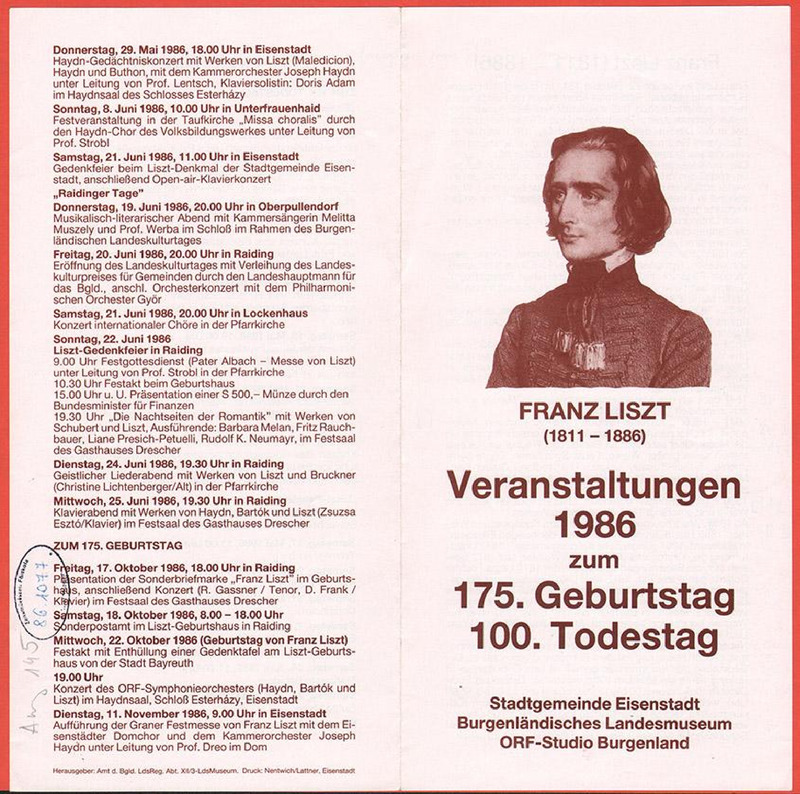 Címoldalán Liszt mellképe, magyaros ruhában. Belül rövid Liszt életrajz és a Liszt emlékév részletes programja.