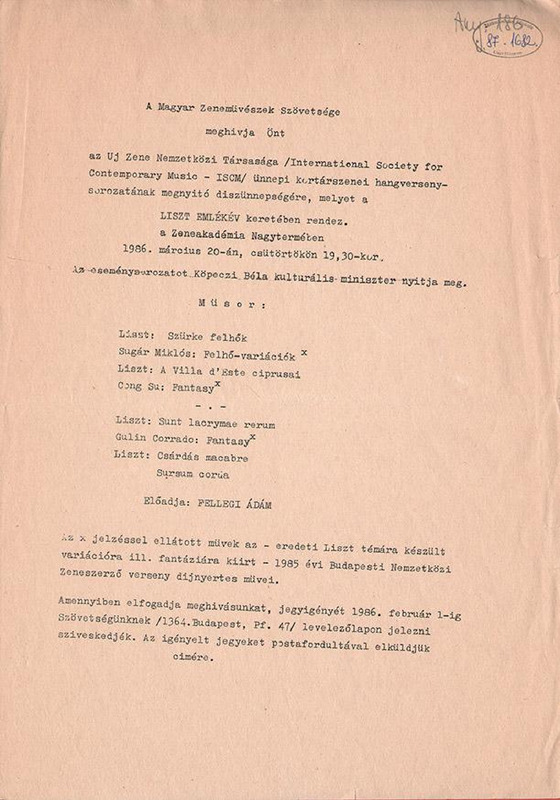 A Magyar Zeneművészek Szövetségének meghívója az Új Zene Nemzetközi Társasága (ISCM) ünnepi kortárszenei hangversenysorozatának megnyitó díszünnepségére.