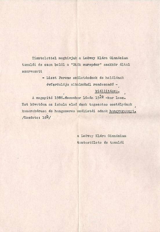A Leövey Klára Gimnázium meghívója a Liszt Ferenc születésének és halálának évfordulója alkalmából rendezett kiállítás megnyitójára és az azt követő hangversenyre.