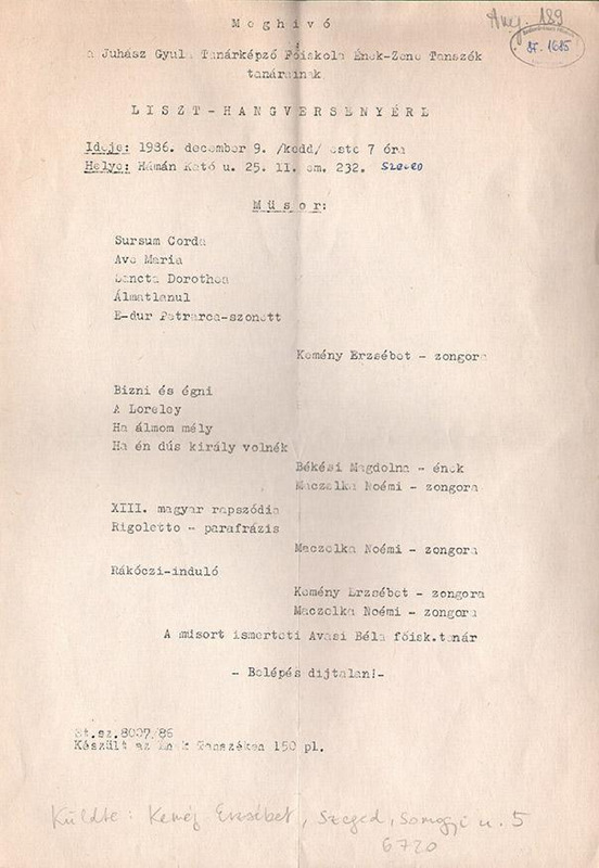 Meghívó a Juhász Gyula Tanárképző Főiskola Ének-Zene Tanszék tanárainak Liszt-hangversenyére. Koncert programja.