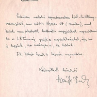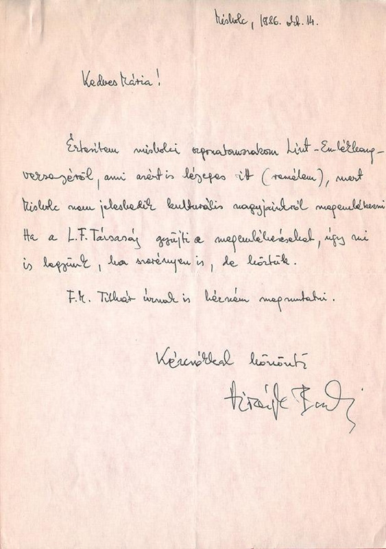 Melléklet: üdvözlő sorok Virágh Endre tanár úr kézírásával Eckhardt Mária részére, miszerint a miskolci orgonatanszak is a megemlékezők sorába lépett. Miskolc 1986. okt. 14.