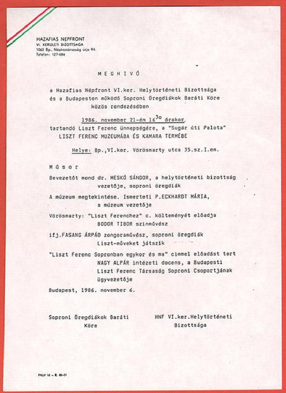 Meghívó a "Sugár úti Palota" Liszt Ferenc múzeumában és kamara termében rendezett Liszt Ferenc Ünnepségre, a Hazafias Népfront VI. kerületi helytörténeti Bizottsága és a Budapesten működő Soproni Öregdiákok Baráti köre szervezésében.