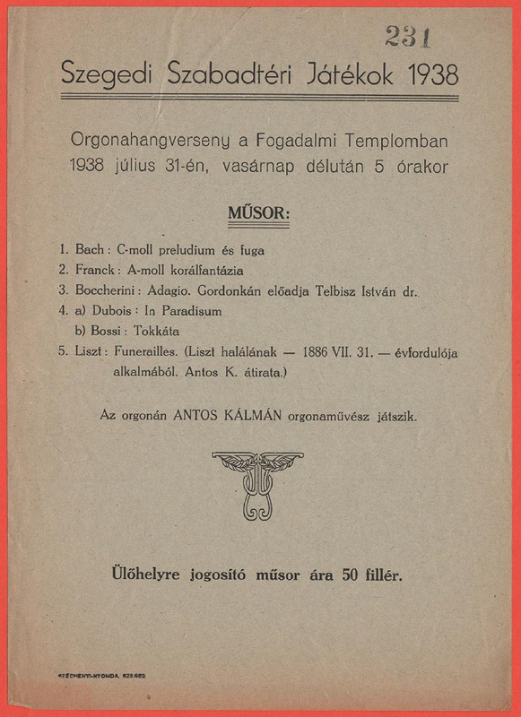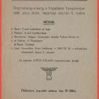 Műsor: Bach: C-moll prelúdium és fuga; Franck: A-moll korálfantázia; Boccherini: Adagio. Gordonkán előadja Dr. Telbisz István; Dubois: In Paradisum; Bossi: Tokkáta; Liszt: Funerailles (Liszt halálának –1886. 07. 31. – évfordulója alkalmából. Antos Kálmán átírata).