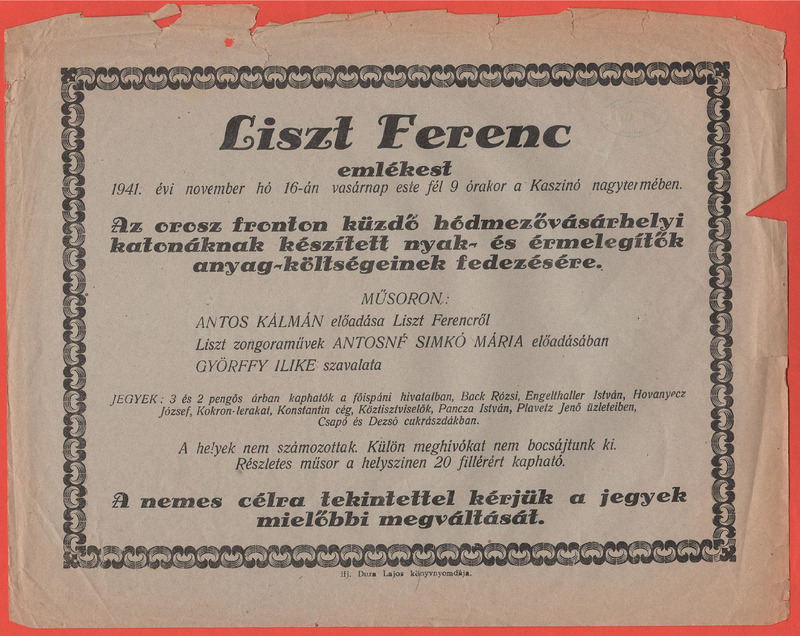 Liszt Ferenc emlékest az orosz fronton küzdő hódmezővásárhelyi katonáknak készített nyak- és érmelegítők anyagköltségeinek fedezésére.