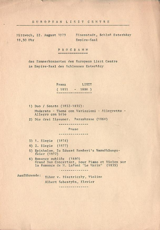Előadők: Bisztriczky Tibor, Sebestyén Albert. Műsor: Duo/Sonate; Die drei Zigeuner (Paraphrase); Elegie No. 1-2., Epithalam, Romance oubliée, Grand duo concertant.