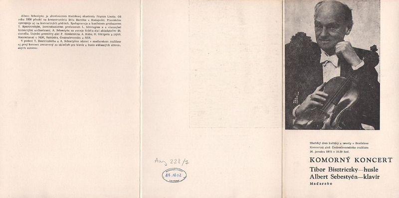 2 fotóval a művészekről. Közreműködik: Bisztriczky Tibor (hegedű), Sebestyén Albert (zongora). Műsor: Duo, La lugubre gondola, A három cigány, Elegie, , Epithalam, Zweite Elegie, Romance oubliée, Grand duo concertant.