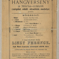 Műsor: Weber, Mihalovich, Chopin, Gounod művei ill. Liszt: Lasst mich ruhen, Magyar rapszódia (?), Les Patineurs - átirat Meyerbeer Prófétájából. Km. Hauk Minnie - ének.