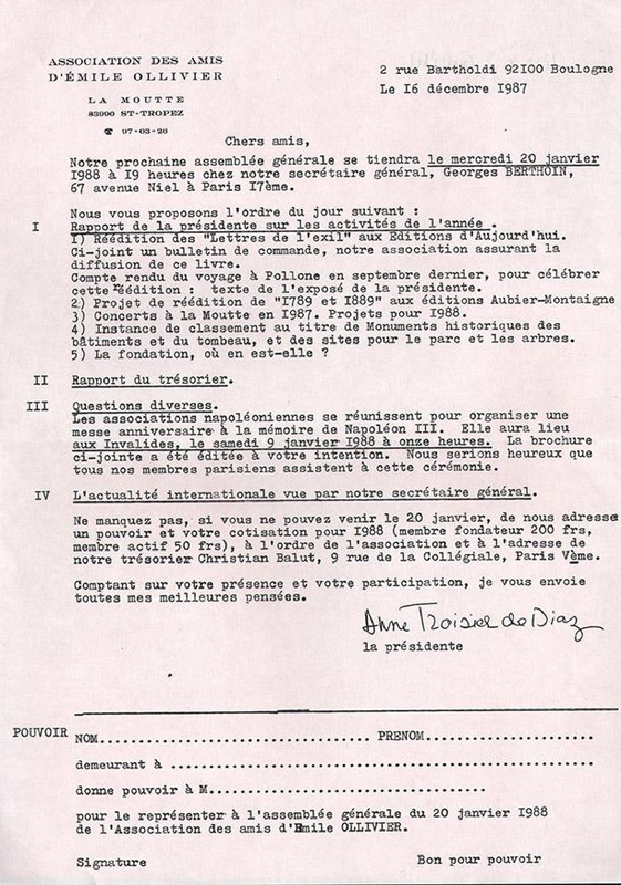 Melléklet: Association des amis dÉmile Ollivier levele Eckhardt Mária részére; prospektus: "Les amis dÉmile Ollivier cél?brent la réédition de ses lettres de lexil écrite ? Polonne entre 1871 et 1874".