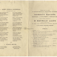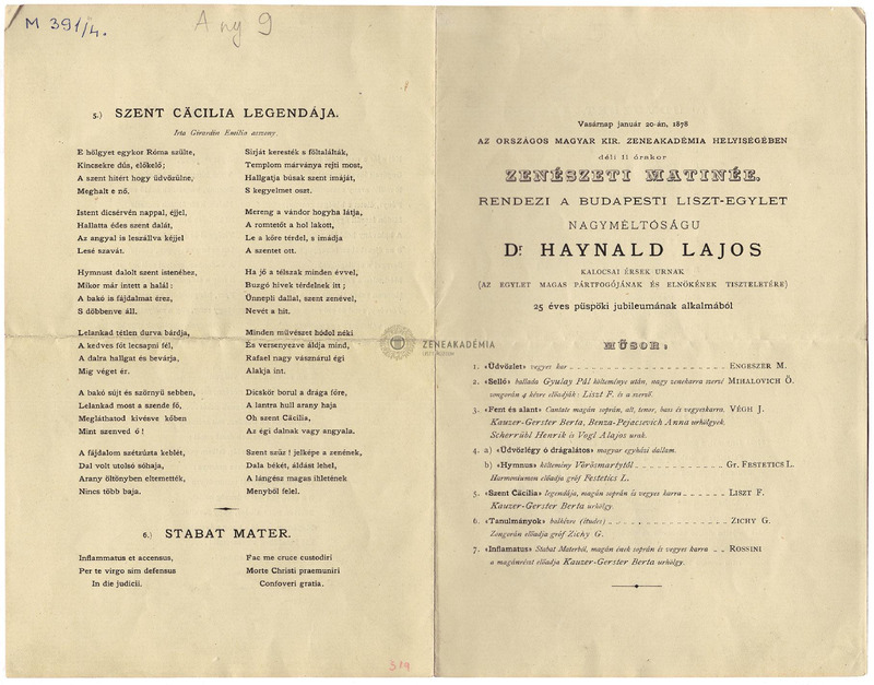 Műsor: tk. Mihalovich Ödön, Festetics L(ajos?), Zichy Géza, Engeszer M(ihály?) művei ill. Liszt: Szt. Cecíilia legendája. Az elhangzó művek szövege közölve magyar nyelven.