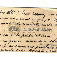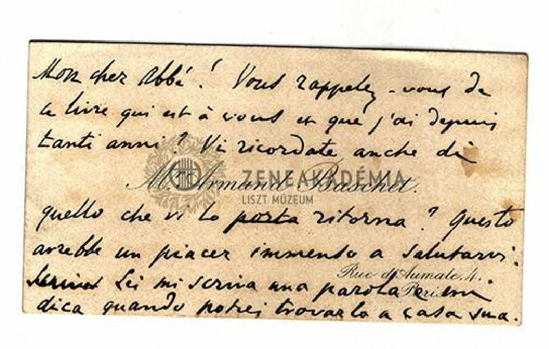 Középen a Név nyomtatva, többi körülötte kézzel írott szöveg fekete tintával. Keltezés nincs.„Mon cher Abbé! Vous rappelez-vous de / ce livre qui est ? vous et que jai depuis / tanti anni ? Vi ricordate anche di / Mr. Armand Baschet. / quello che vi lo porta ritorna ? Questo / avrebbe un piacer immenso a salutarvi. / Lei mi scriva una parola e mi / dica quando potrei trovarlo a casa sua. / Arrivo da Italia dopo tre anni di / assenza e di viaggi! Per il momento / sono al Grand Hotel. 3?me Etage. / Appartement 298. Mi scriva un bigliettino, / 1000 u 1000 complimenti, / tutti da cuore.”