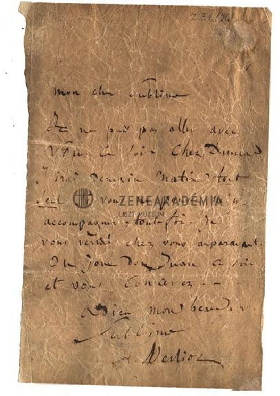Berlioz nem tud Liszttel tartani este Dumas-hoz. Keltezés nincs, valószínűleg Párizs.„Mon cher Sublime / Je ne puis pas aller avec Vous le soir chez Dumas / J’irai demain matin tout / seul si vous ne pouvez m’y accompagner […]”
