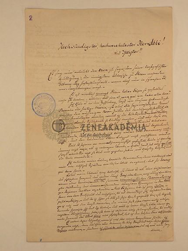„Hochwürdigster, hochverehrtester Herr Abbé! / und Meister!!! / Es sey mir erlaubt der Erste zu seyn, der seine tiefgefühlte / Huldigung, die innigsten Wünsche zu Ihrem nahenden / Geburtstag hochachtungsvoll wenn auch nur in schwachen Tö- / nen darzubringen wagt [...] unterhänigsten Diener und bewun- / derer Anton Fáy“