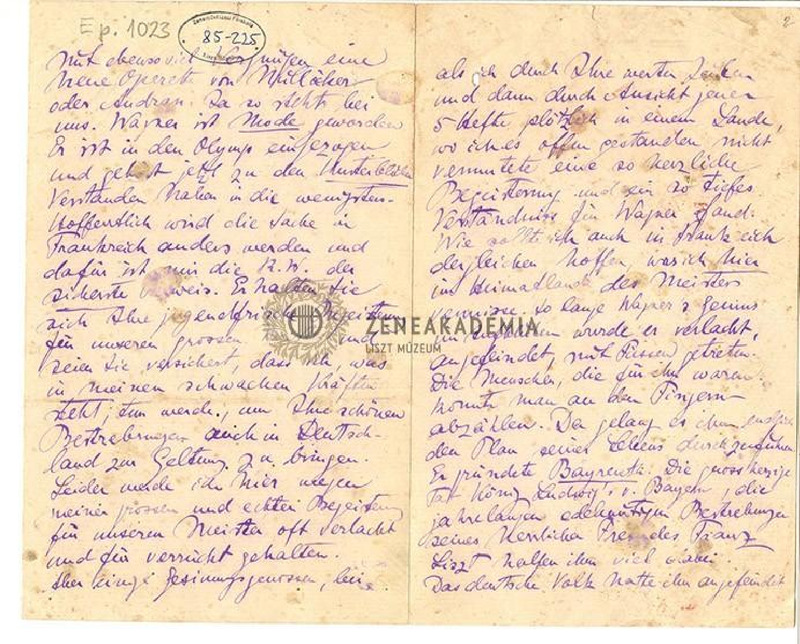 Keltezés nincs.A levélíró Franciaországban nem remélt jó fogadtatást kapott Wagner műveivel. Wagner harcainak, Bayreuth alapításának leírása. (Liszt is említve.) Wagner-Verein létrehozása, Wagner térhódítása más városokban, Parsifal sikere. Wagner halála után visszaesés: műveit mindenütt játsszák, de színvonal kérdéses. München és Karlsruhe (Mottl vez.) kiv. eltorzítva adják elő őket, mégis tetszenek: Wagner divat lett. Ígéri, hogy mindent megtesz Wagner művei érdekében.
