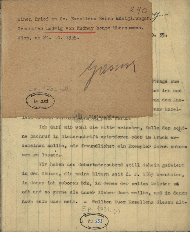 Kísérőlevél a Schottenhof és Epilog c. nyomtatványokhoz.1v, 2v: Eduard von Liszt gyorsírásos jegyzetei.