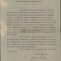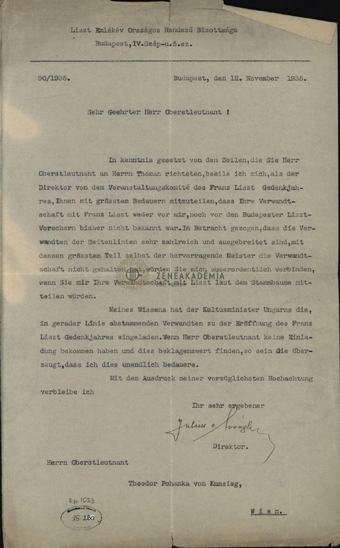 Válasz a címzett Thomán Istvánhoz írt levelére. Pohanka rokonsága Liszttel eddig ismeretlen volt; mutassa be családfa alapján. Pótlólag meghívják az ünnepélyes megnyitóra.