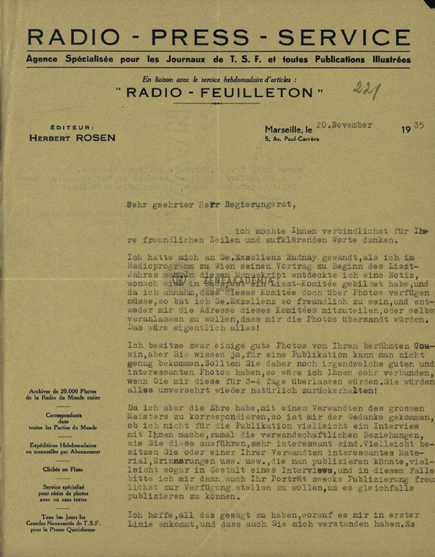 Herbert Rosen marseille-i kiadó levele ifj. Eduard von Liszthez