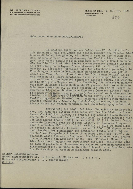 Megjegyzések a Pester Lloydban megjelent, Liszt családjáról szóló két cikkhez. Az Eduard von Liszt szegedi díszdoktorátusával kapcsolatos gyakorlati problémák.