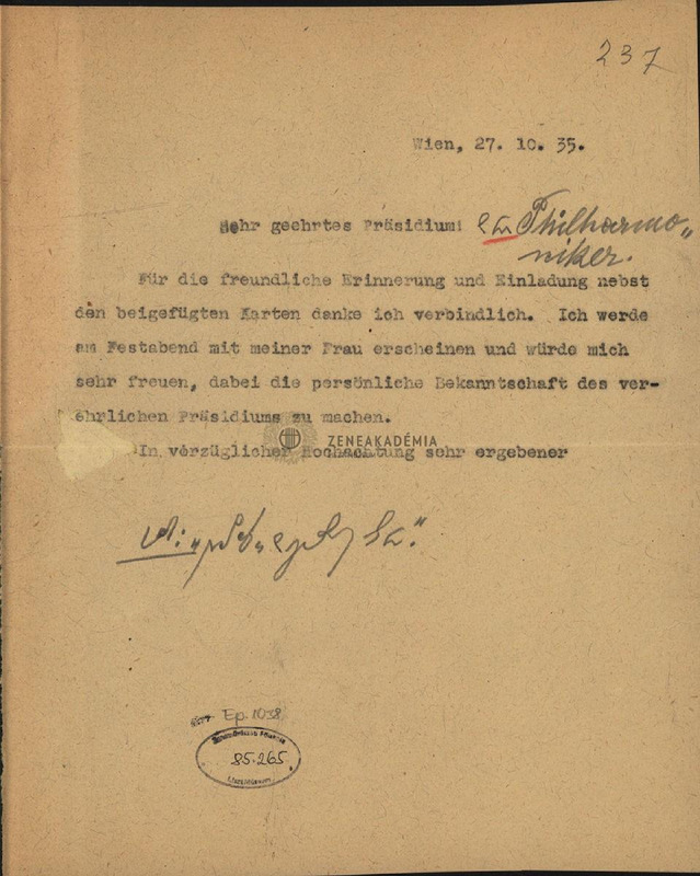 Ifj. Eduard von Liszt levele a Bécsi Filharmonikusokhoz