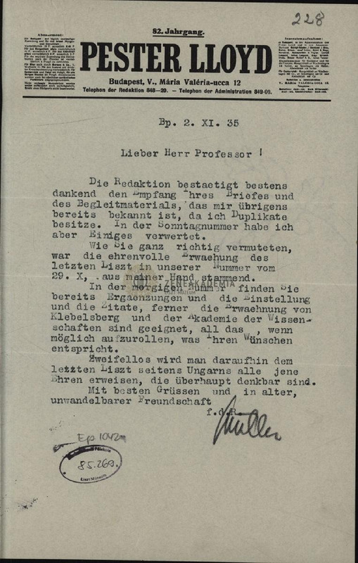 Eduard von Liszt levelére válasz; Müller a Csekey levelében említett Pester Lloyd-beli Liszt-cikk szerzője.