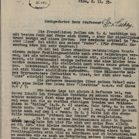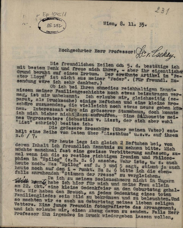 Csekey 11. 05-i levelére válasz. A Pester Lloyd-beli cikket nem Eduard von Liszt irta. A család történetéről néhány füzetet és egy brosúrát küld. Többször hivatkozik az „Epilog”-ra. Az okt. 22-i családi Liszt-ünnepről fotót küld.