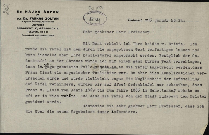 Hajdu Árpád és Farkas Zoltán levele ifj. Eduard von Liszthez
