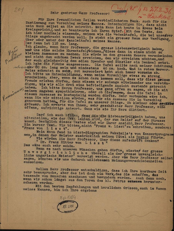 Ifj. Eduard von Liszt feleségének levélfogalmazványa Farkas Zoltánhoz