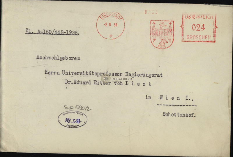 Köszönet a Liszt-emléktárgyakért. Meghívás az 1936.06.21-i emléktábla-avatásra.