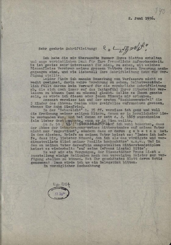 Megjegyzések az újság Liszt-cikkéhez. Liszt Ferenc véleménye id. Eduard von Liszt lovagrend-felvételéről.