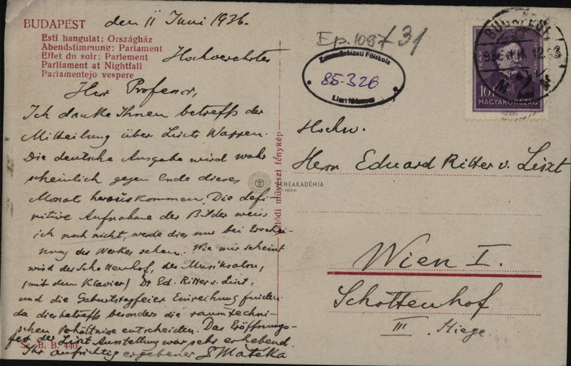 Mátéka Béla levelezőlapja ifj. Eduard von Liszthez