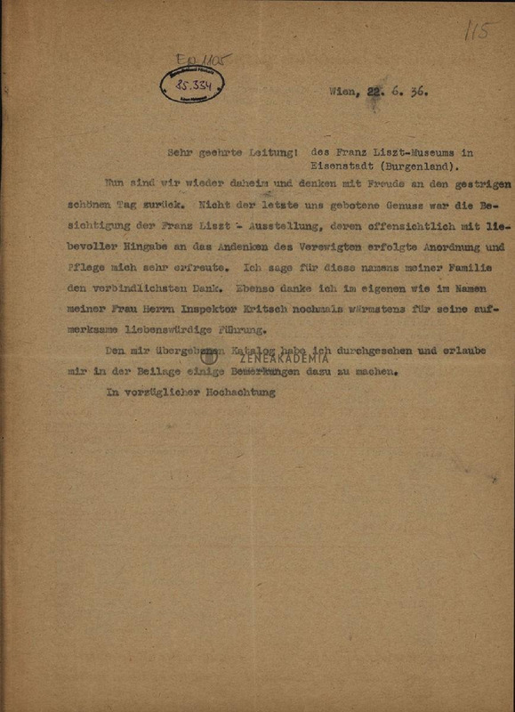 Ifj. Eduard von Liszt levele a kismartoni Haydn múzeum vezetőségéhez