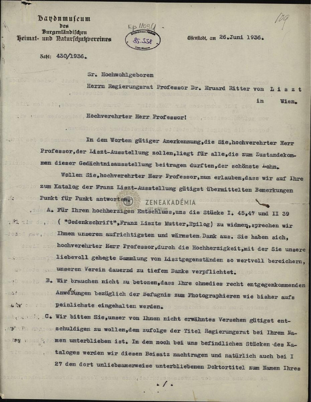 A kismartoni Haydn múzeum igazgatóságának levele ifj. Eduard von Liszthez