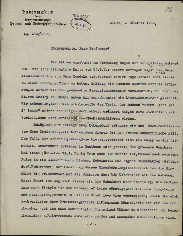 Koudela Géza Liszt-könyvét a múzeum még nem kapta meg. Csekey Istvánnak elküldték a Liszt-emlékfüzetet.