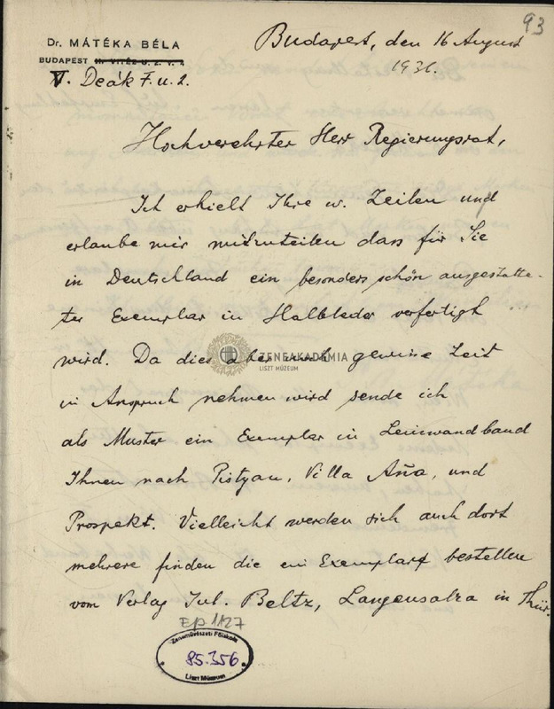 Mátéka Béla levele ifj. Eduard von Liszthez