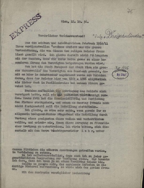 Ifj. Eduard von Liszt levele a Sängerbund Dreizehnlinden vezetőségéhez