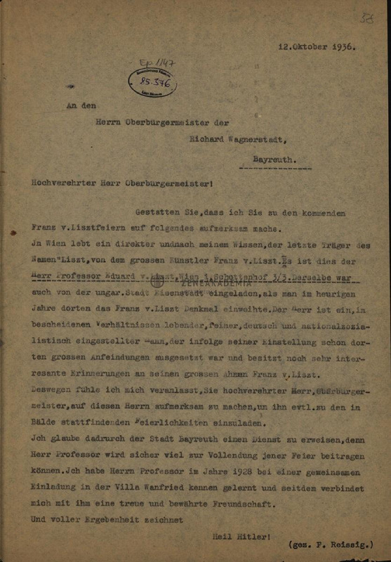 Reissig ifj. Eduard von Liszt személyét a bayreuthi Liszt-ünnepségek alkalmából Schlumprecht figyelmébe ajánlja.