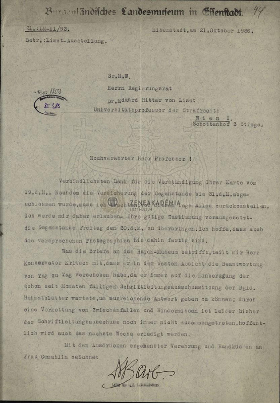 Válasz ifj. Eduard von Liszt 10.19-i lapjára. A kismartoni múzeumnak kölcsönadott emléktárgyakról.