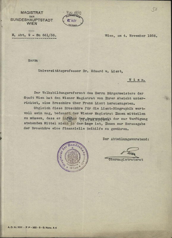 A bécsi magisztrátus levele ifj. Eduard von Liszthez