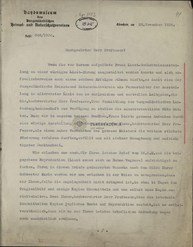 Köszönet a Liszt-emlékkiállításra átengedett anyagért. A Haydn múzeum egy részét Liszt-szobává szeretnék alakítani.