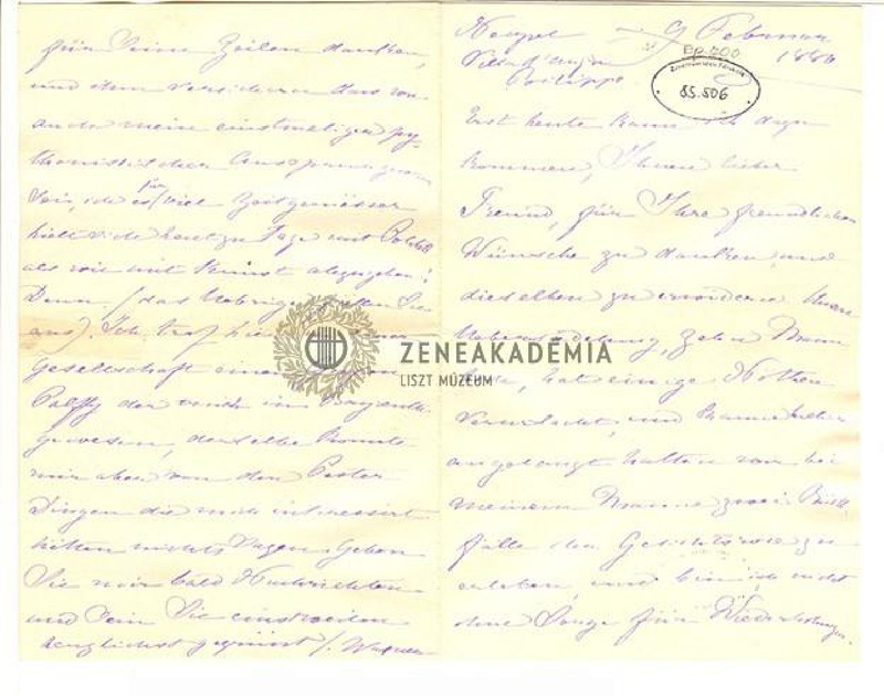 Wagner orbáncban megbetegedett, Cosima visszaeséstől tart. Érdeklődik Liszt felől, Mihalovich kérdezze meg tőle, megkapta-e levelét Firenzében. Kérdés Mihalovich operájának drezdai bemutatójáról; nem kellene a Hagbarth és Signe helyett a Wieland der Schmiedet benyújtania, hátha kifogásokat emelnek. Cosima örül, hogy Wüllner bemutatta a Sellőt. Üdvözli Apponyi grófot. Egy társaságban találkozott Pálffy gróffal, de nem kapott tőle pesti híreket.