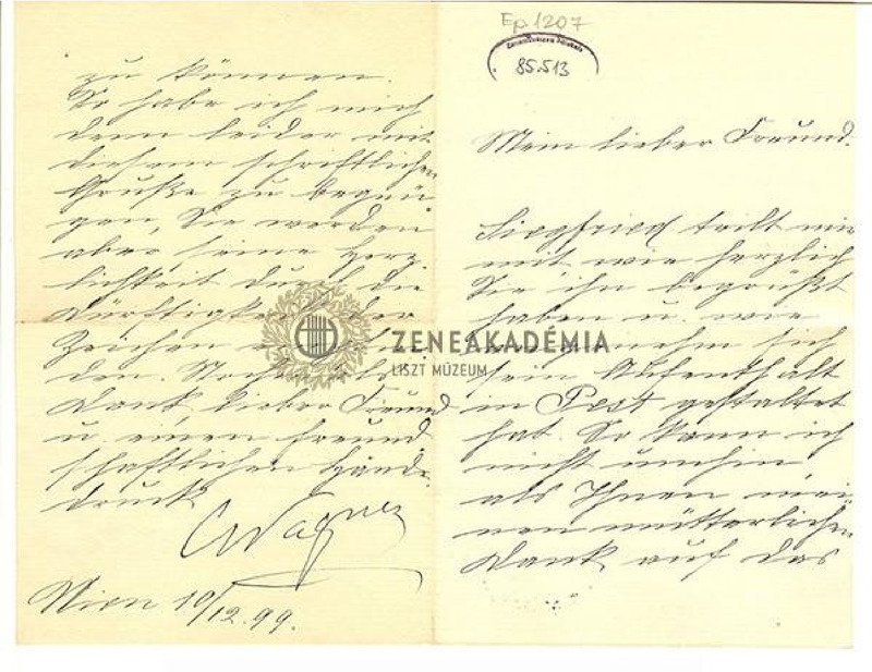 Ismeretlen kézírás. Köszönet Siegfried Wagner szívélyes budapesti fogadtatásáért. Kérdezi, ápolják-e Magyarországon Liszt emlékét.