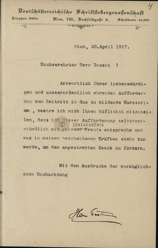 A Deutschösterreichische Schriftstellergenossenschaft képviselőjének levele ifj. Eduard von Liszthez