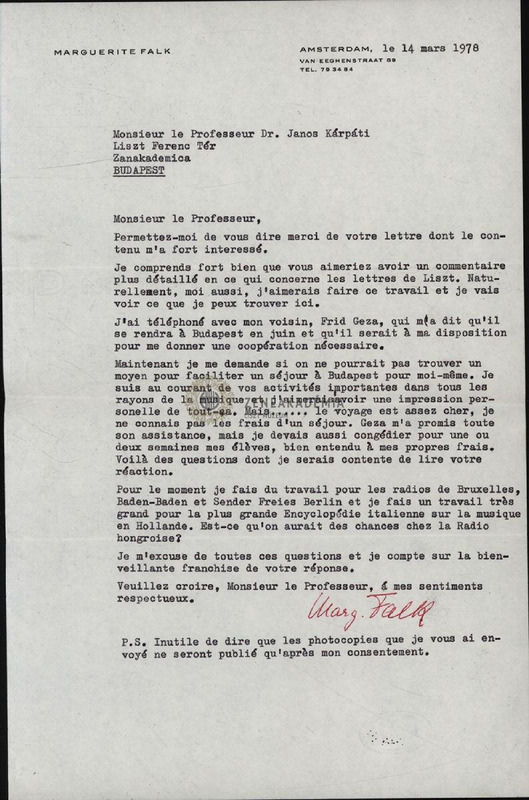 Francia nyelven. Nagyanyjához íródott 5 Liszt-levél és 1 dedikáció, továbbá egy Mottlnak címzett névjegykártya és egy li?ge-i bankett menüjének másolatát küldte meg, hozzájuk írt német kommentárjával.