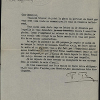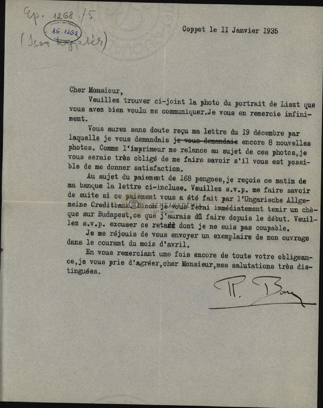 Képeket kér Liszt-ikonográfiája számára. Mellékeli Darier&Cie bankár Boryhoz írt levelét (Genf, 1936.01.10., 1 folio) és a Bory által kért dokumentumok listáját (1 folio).